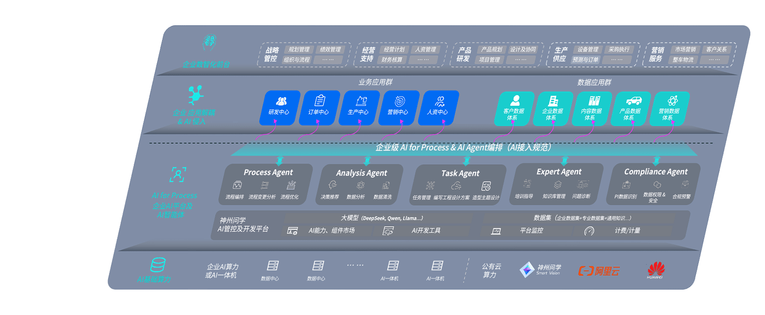 端到端的一站式AI工作空间深度融合了从企业战略规划到日常经营的全流程业务板块,,,,定向解决车企内部领域多、、、部门多、、链条长、、、场景碎片化等难题,,,支持车企快速构建以AI为核心的生产力写作体系,,实现任务执行与AI能力的无缝集成与交互