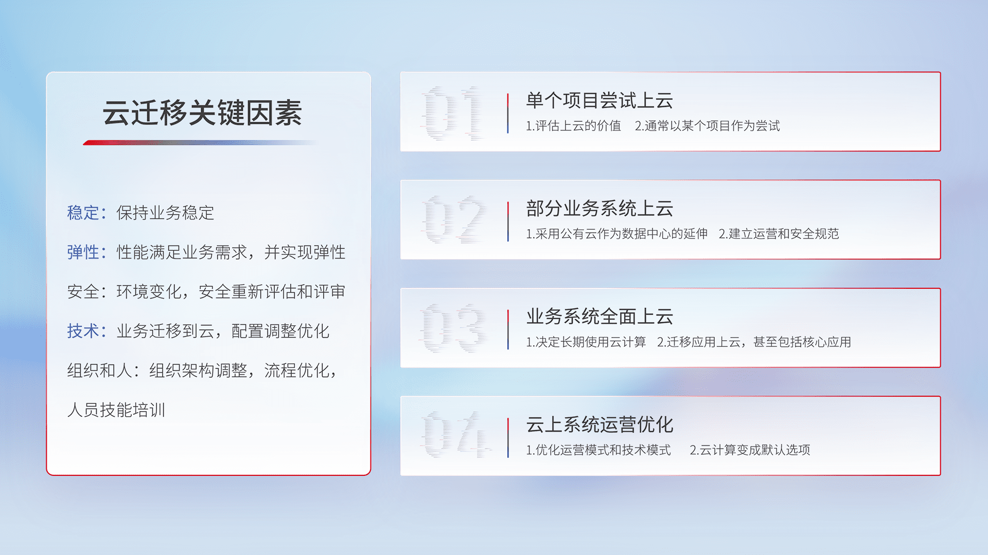 结合实际业务,,从规划设计、、、、云平台选型、、、云原生改造、、、数据迁移、、、、集成交付,,,迁移全过程为客户识别最佳上云路径,,做好风险识别管理,,,设计网络架构、、、身份权限、、、、安全审计合规、、、、操作审计、、日志审计、、、监控告警策略、、、、多站点容灾设计等,,,,对云上基础设施进行整体规划,,提升IT治理水平,,,,以满足弹性、、、、高可用、、、、高性能的需求。。。。