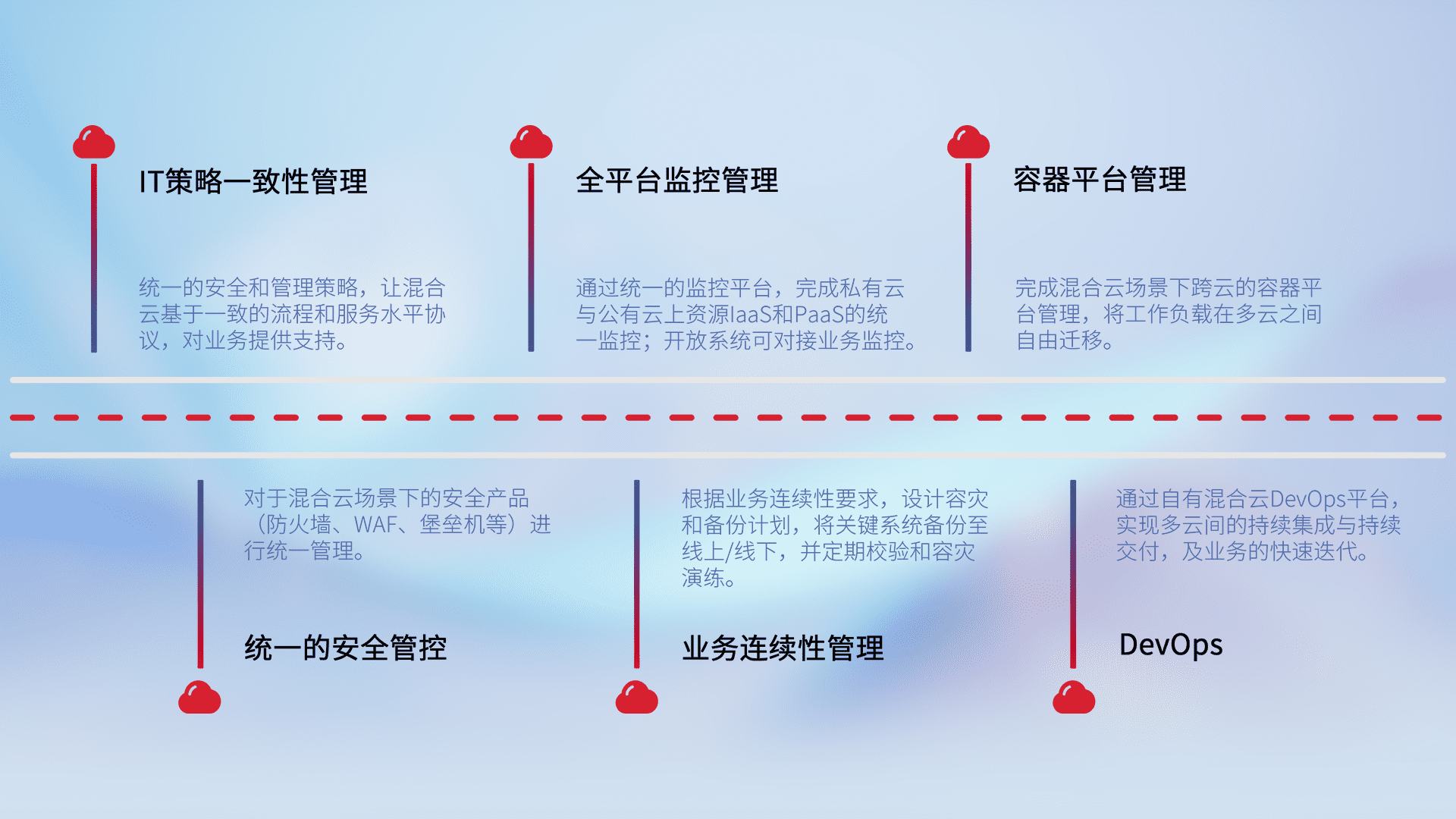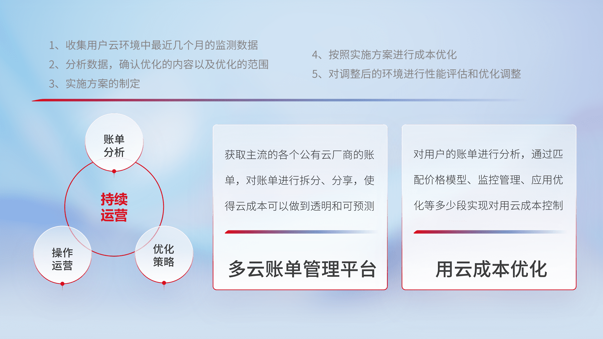 通过多云纳管,,,,以统一的资源数据模型把客户的云资源进行抽象和封装,,进而实现对多云资源的统一操作,,保障云资源管理的可靠性、、、稳定性与可用性。。量身定制化运维内容,,配置、、、、开发运维、、、、补丁管理、、备份、、、、监控、、、认证和访问管理、、、、审计和日常巡检等,,,保障在用云过程中的可靠度,,稳定度以及高可用率。。